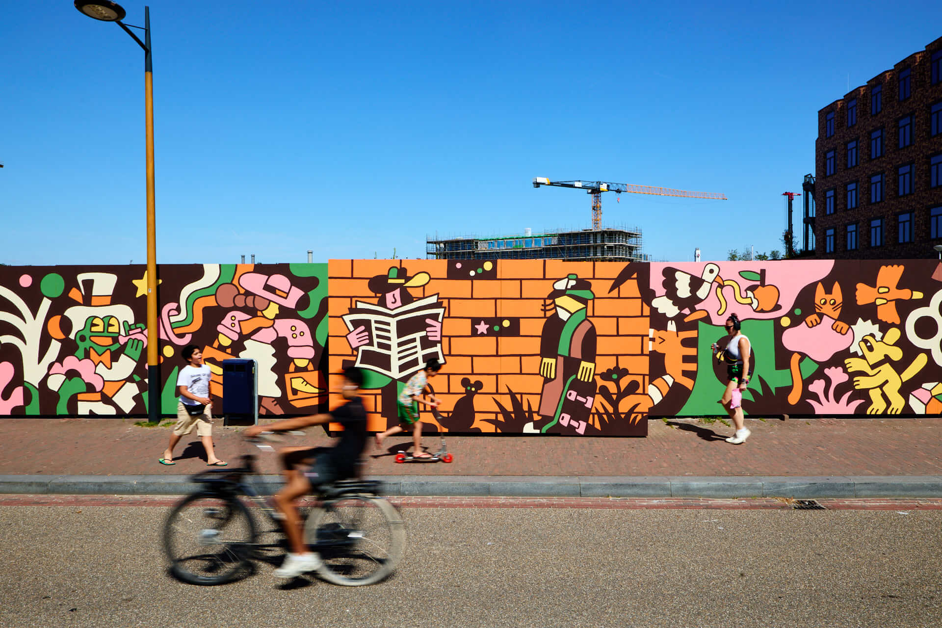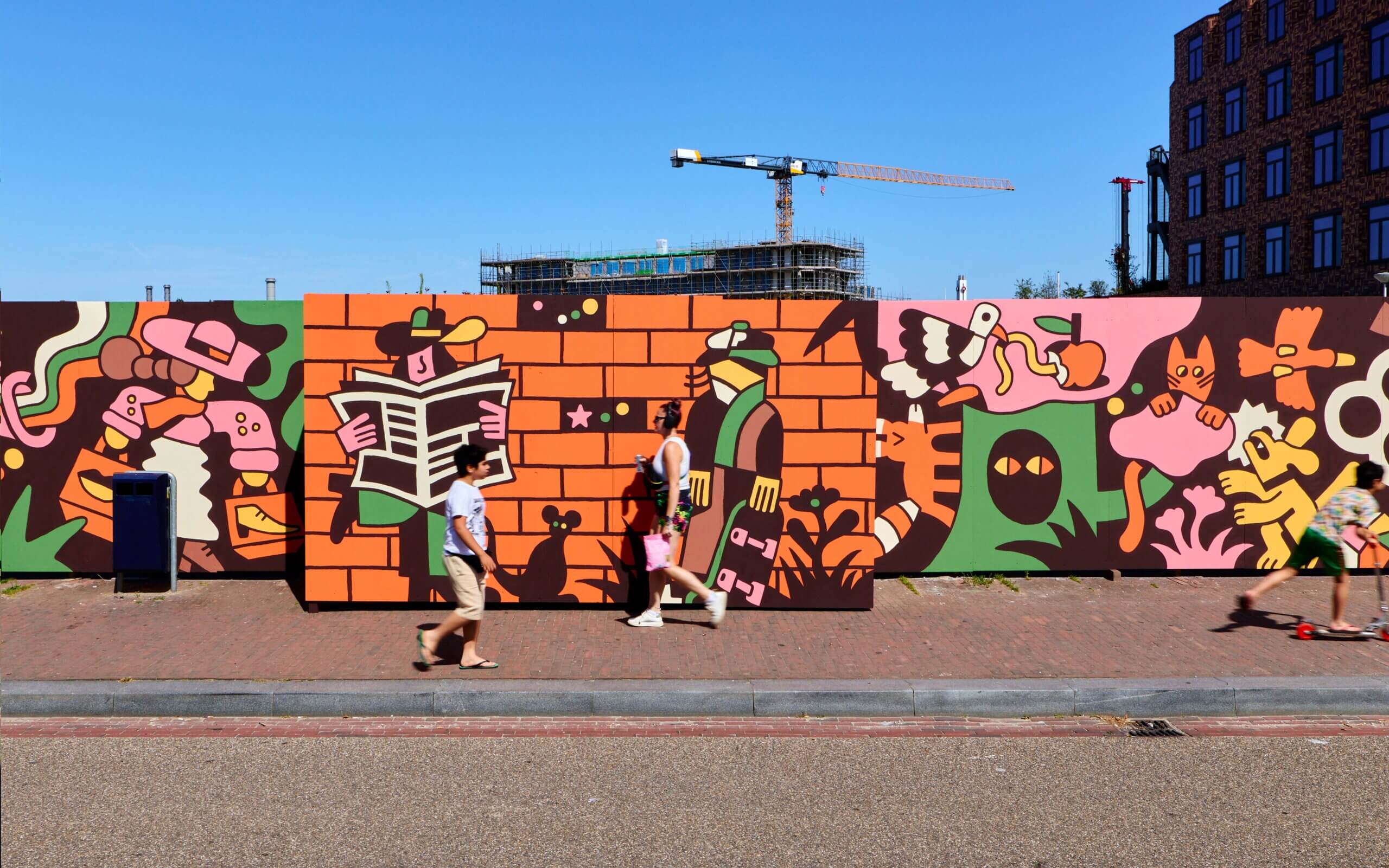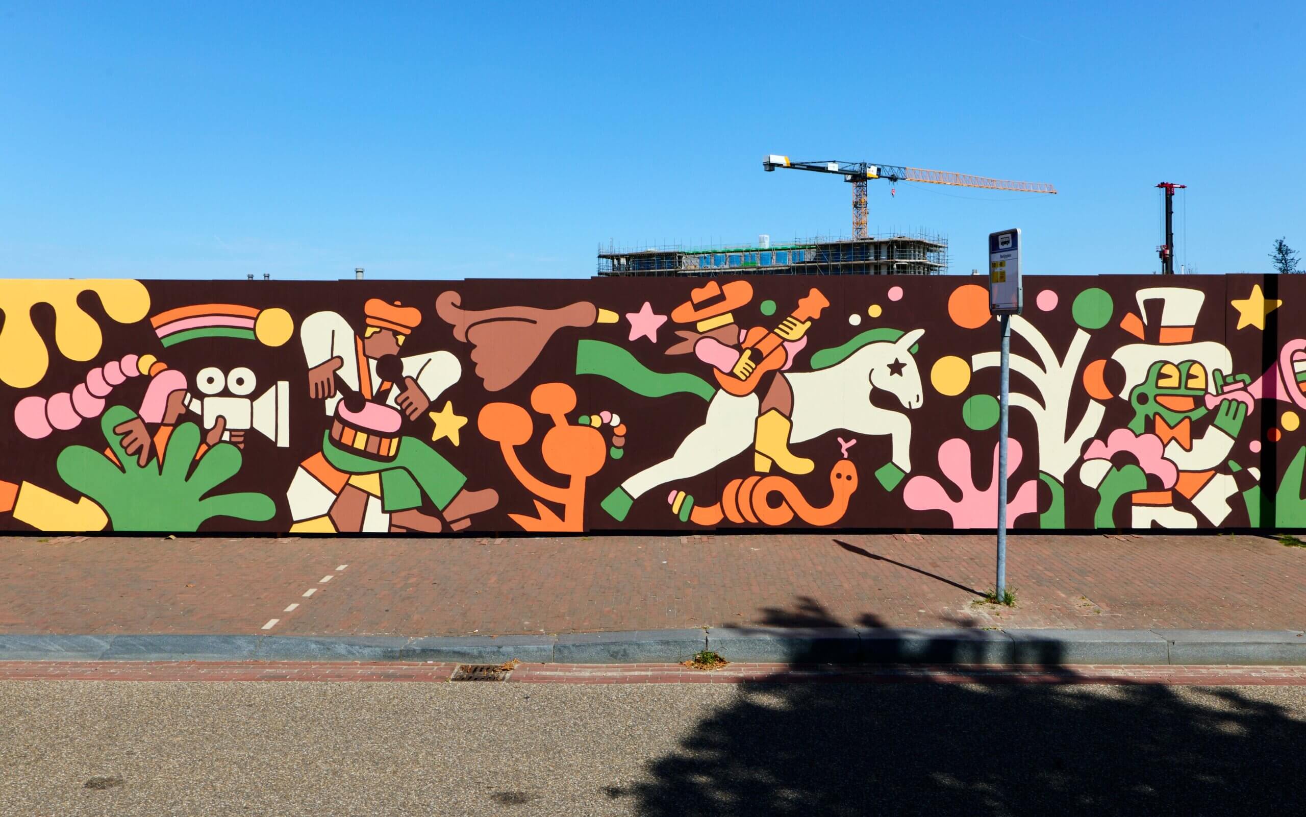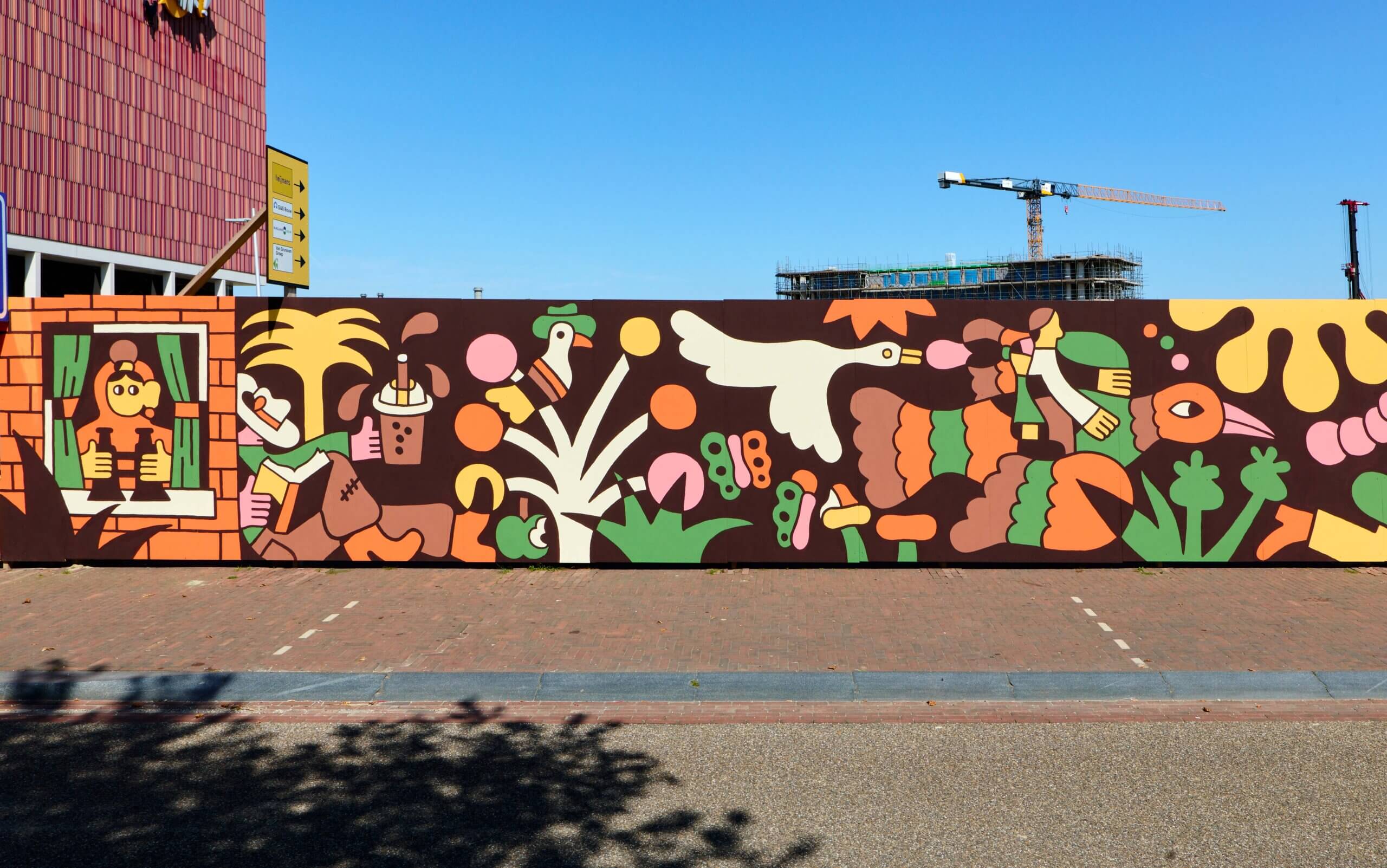 This 50-meter-wide wall tells a story that reflects the dreams and ambitions of a new neighborhood that is developing and evolving, like Leidsche Rijn. Through characters and scenes, I have touched on themes such as hospitality, peacefulness, cohabitation, art & culture, and a safe environment where people can play and explore. While working with these topics and trying to implement all of this into the design, the main goal was also to simply create a piece that just FUN for the people of the neighbourhood that pass by on a daily basis.